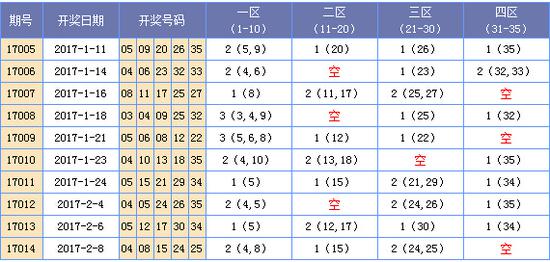 个人习惯将大乐透号码分为四个区间:1-10为一区;11-20为二区;21-30为三区;31-35为四区;根据每个区间的号码分布情况来判断出最新一期会出现几个空区,以便缩小选号范围。