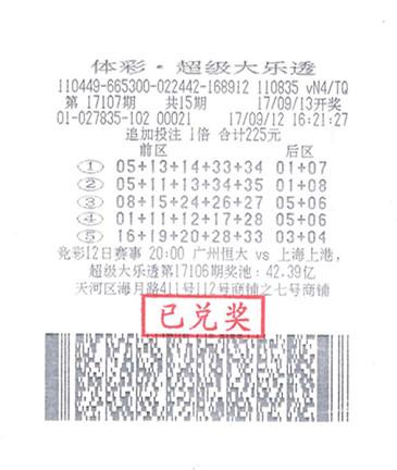 10月14日,体彩大乐透第17120期开奖号码为“08、15、24、26、27 + 05、06”,全国开出7注头奖,其中广东省广州市天河区海月路的4401027835号投注站彩民以一张15元5注号码追加投注彩票,中得1注1079万追加头奖。