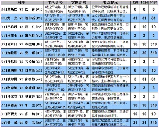 12155期周二胜负彩将竞猜欧冠小组赛第五轮的赛事,由于接近尾声,出线形势已经逐渐清晰,这个时候往往会出现很多形势盘,在竞猜的时候一定要注意区分,通过往绩同时段的足彩来看,基本都是大奖格局,本期有望延续。 提前出线:曼联不会轻易输球 曼联、马拉加和波尔图是三个已经出线的球队,本轮做客加拉塔主场,早期澳彩只是开出平手的盘口,目前则已经升盘到半球的位置,看似曼联无战意,但回顾红魔近年欧冠小组赛,从未像本赛季打得如此出色,本场被如此低看,是借形势做局,红魔未必输球;波尔图也是提前出线,主场击败萨格勒可锁定榜首,目前的盘赔优势非常明显,单3疑问不大;泽尼特形势上必须取胜,而马拉加则提前出线,原本实力优势就不明显,所以马拉加极有可能成为提前出线唯一输球的球队。 赢球出线:巴萨拒绝再度爆冷 巴萨在欧冠小组上做客凯尔特令人意外,本轮再度做客莫斯巴,只要击败对手就能提前获得出线资格,考虑到其实力超群,此役赢球应该毫无悬念。本菲卡则要在主场对阵凯尔特人,主队赢球则可将积分拉平,而客队一旦获胜则可提前获得出线资格,而目前亚盘主队让到一球/球半的位置,应该是对主胜非常支持。 日尔曼在近期的欧冠上表现不俗,而本轮做客对阵迪纳摩,平局即可出线,获胜自然不必多言,主队则必须要取胜,坐镇主场必定全力进攻,如此后防空虚,日尔曼客胜的机会比平局更大。 沙尔克排名榜首,本轮主场迎战第三的奥林匹,击败对手,球队可顺利晋级,而阿森纳则在酋长球场迎战蒙彼利埃,如果沙尔克击败奥林匹,那么枪手同样是赢球出线的格局,此小组齐齐打出主胜疑问不大。 死亡之组中,多特本轮要做客对阵阿贾克斯,曼城基本出局,多特做客赢球自然是出线,即便是逼和阿贾克,也能确保成功出线,可以说全部的主动权都掌握在自己手里,而本赛季多特在欧冠小组赛上的表现可圈可点,值得信赖。 其余对阵:布拉加拒绝被双杀 先说说死亡之组的曼城VS皇马,主队要晋级只能寄希望奇迹,而皇马紧握主动权,做客游刃有余,曼城奇迹不必指望;尤文和切尔西虽然只是相差1分,但考虑到切尔西末轮对阵北西兰3分稳阵,所以实际上斑马军团的直接竞争对手是矿工,本轮矿工对阵北西兰赢球疑问不大,所以斑马军团本轮只要击败切尔西才能确保末轮有机会和对手竞争,而对于蓝军来说,只要客场逼和尤文,末轮击败北西兰即可。 克卢日和加拉塔都要为小组第二努力,除了曼联外,其余三队的积分非常接近,而克卢日坐镇主场居然无力让球,看来本场可信度不高;安德莱和米兰分积4分和5分,本场比赛谁赢球将占据绝对主动权,考虑到欧战经验和实力对比,米兰还是略微占据优势,最低限度看好米兰客场不败。 综合来看,本期欧冠胜负彩难度不如上期,只是有部分比赛形势和赛果未必吻合,将形成心理冷门,奖金方面估计在10万以内。