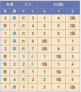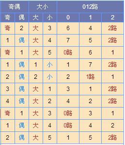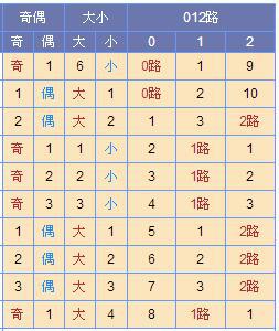 红一:近5期尾数走势为:8-6-1-5-3,重尾无,大数尾占优。在近10期中开出的尾数7-2-5-0-0-8-6-1-5-3,缺4、9尾,其中大数尾开出5期,小数尾开出5期,上期开出3尾,本期关注小数尾,首选1路尾。