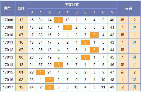 蓝球:近5期尾数走势为:6-3-1-2-2,重尾2,小数尾占优。近10期尾数走势为:3-4-7-6-7-6-3-1-2-2,缺0、5、8、9尾,近10期小尾数开出6次,大尾数开出4次,上期开出2尾,本期重点大尾数码,主防0 1路尾码。推荐:06防13 07
